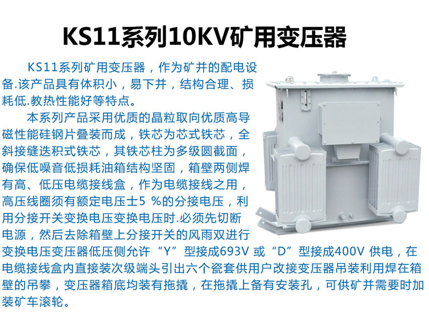 KS11變壓器適用于煤礦井下中央變電所、井底車場、總進風道和主要進風道,雖有瓦斯但無爆炸危險的場所。也適用于隧道比較潮濕的環(huán)境中